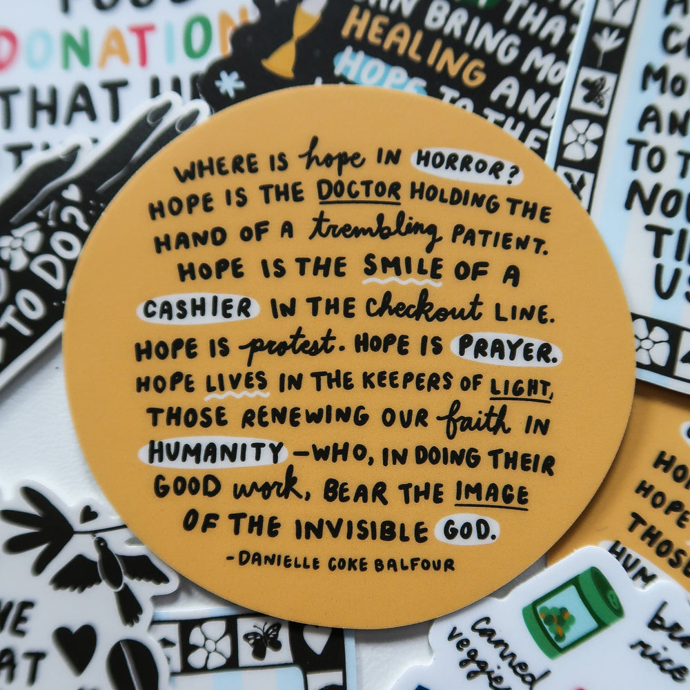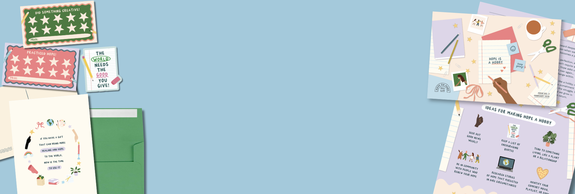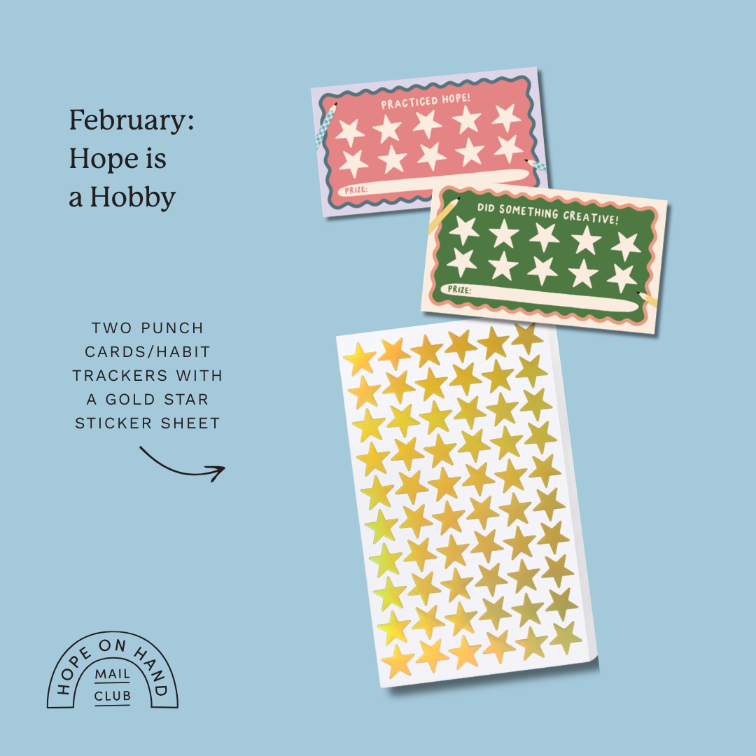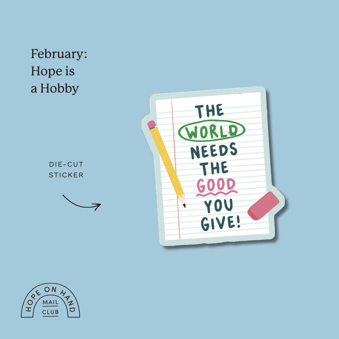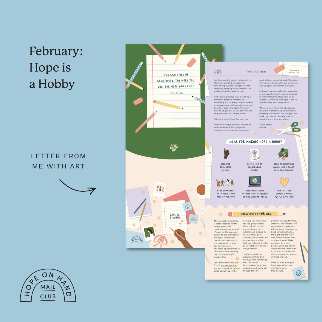 Get monthly, illustrated encouragement delivered right to your mailbox (that's right, the old-fashioned way!) when you join the Hope on Hand Mail Club! Each month, you'll receive an envelope full of illustrated art, stories, and goodies created to keep you hopeful as you advocate for justice & empathy in your everyday life.