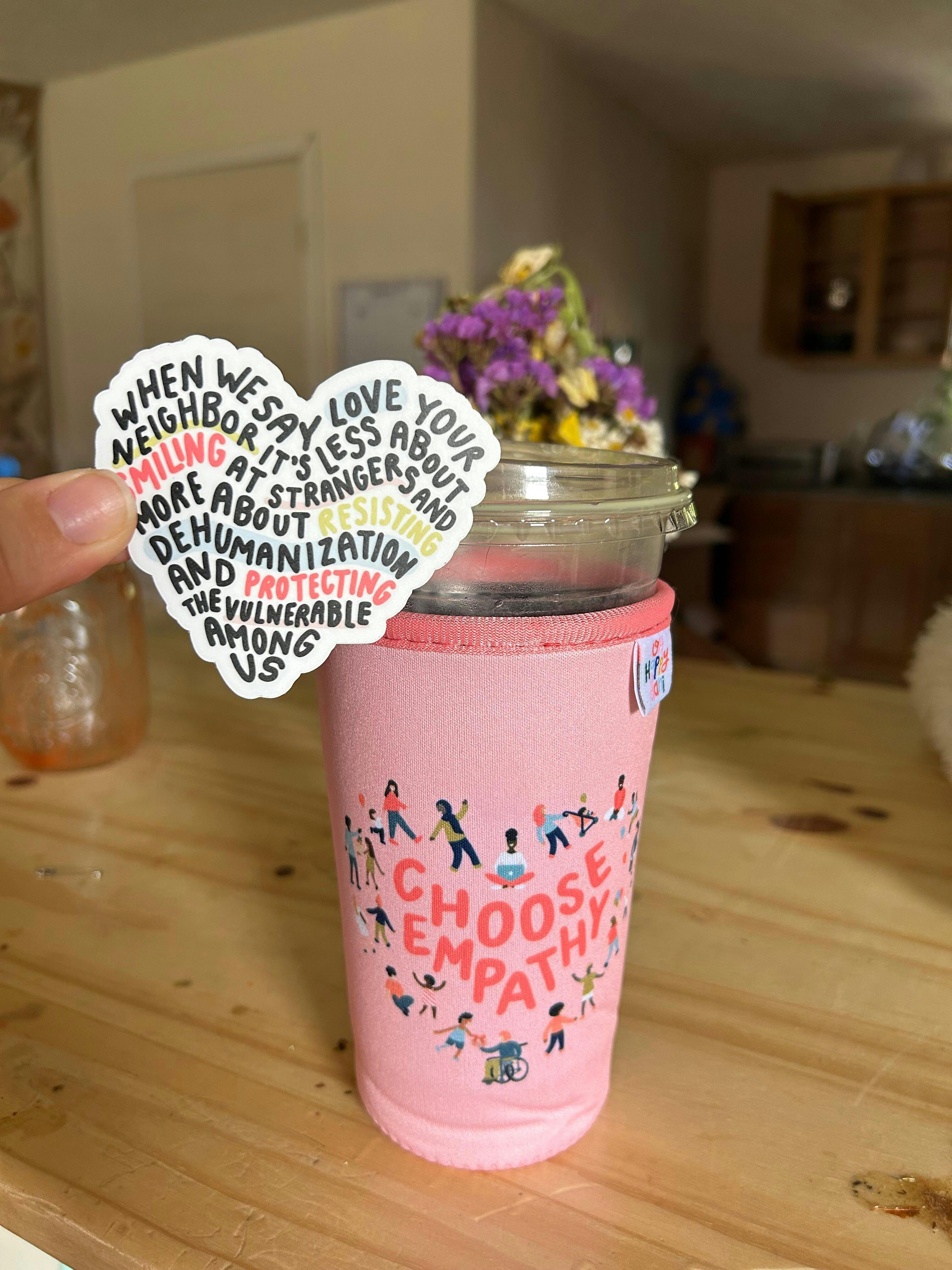 Remember the power of empathy while enjoying your favorite iced drink! This drink sleeve fits most small and medium-sized to-go cups from your local cafe or coffee shop. It's also both washable and reusable!