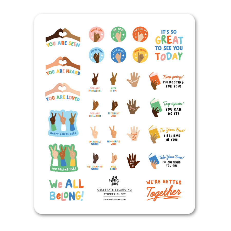 Give bite-sized encouragement with this sticker sheet all about reminding others that they matter and belong. With smaller stickers celebrating a job well done, to larger ones designed to echo messages of inclusion, this sheet is sure to spark joy!