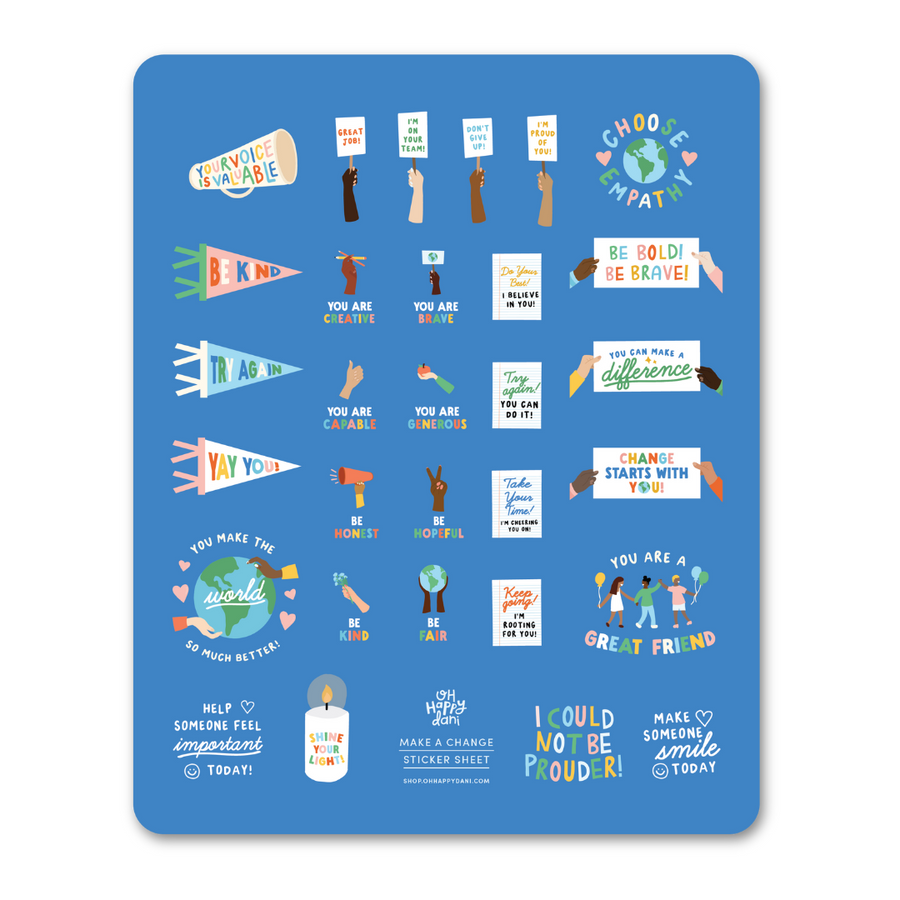 Inspire action with this sticker sheet that combines inspiring messages with empowering reminders. With messages like "you can make a difference," "you are creative," and "shine your light," you're sure to encourage others with these small-but-mighty phrases. This sheet also includes messages that can go on a worksheet or a note home, like "keep going" and "i'm proud of you!"