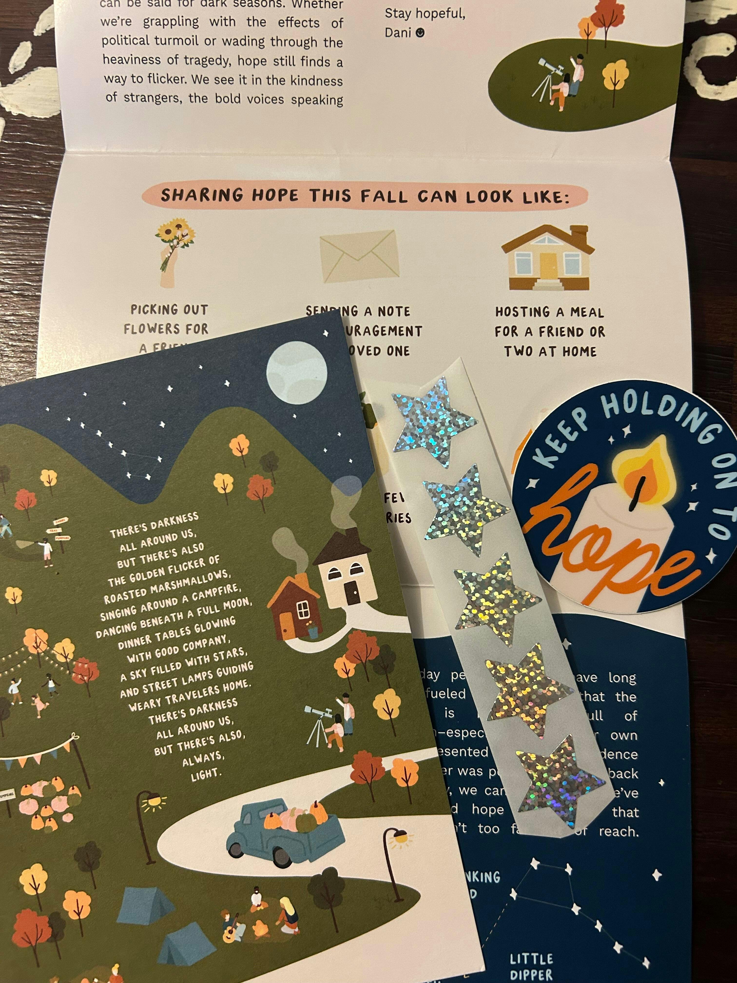 The goal is simple: helping you keep hope on hand when you need it. Whether you're hanging it on your wall or passing it on to comfort a loved one, the Hope on Hand Mail Club is meant to inspire you to delight in your values and remind you that hope is still present all around us, even when it's hard to see.